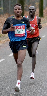 Bei der Durchgangszeit von 62:22 Minuten bei Halbmarathon waren noch 30 Läufer zusammen. Den Dreifacherfolg vor dem Kenianer Jonathan Kiplimo Mayio (2:04:56 Stunden) führte der 21-jährige Debütant Ayele Abshero mit der Weltklasseleistung von 2:04:23 Stunden an. Der Junioren Cross-Weltmeister von 2009 verbesserte nicht nur den Streckenrekord aus dem Jahre 2008 von Haile Gebrselassie um 30 Sekunden, sondern lief damit auch das schnellste Debüt aller Zeiten auf einem AIMS-zertifizierten Kurs. Hinter Haile ist er damit der zweitschnellste Äthiopier und belegt Platz vier der in Dubai mächtig aufgemischten ewigen Weltbestenlisten. Kennzeichnend für den äthiopischen Erfolg war auch, dass der Rennfavorit und London Marathon Sieger Martin Lel aus Kenia nach 30 Kilometern die Zügel hängen ließ und ausstieg. Dubai rückte durch die sensationellen Ergebnisse auf Platz 3 der schnellsten Marathonkurse bei den Männern auf. Noch führt Berlin mit einem 10er Durchschnitt von 2:04:54,9 Stunden vor Rotterdam (2:05:06 Stunden). Mit 2:05:10 Stunden schob sich Dubai nun vor London (2:05:20,6 Stunden). Die Preisgelder in Dubai sind enorm. Eine Viertel Million für Sieg, für die Scheichs ein Klacks, denn 30.000 Dollar und mehr legt man für einen guten Jagdfalken und für den gesamten Etat des Dubai Marathons bekommt man gerade erst mal ein erstklassiges Rennkamel, das schon mal bis 10 Millionen Euro kosten kann.