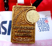 Eine Ärzteschar durchmustert an gleicher Stelle mit Argusaugen die immer armseliger ausschauende Läuferschar. Wer diesen sinnvoll eingebauten Flaschenhals heil überwunden hat, nähert sich wieder der Innenstadt. Erst am Arnoufer entlang mit Blick auf die behäuserte Ponte Vecchio, dann geht es Schlag auf Schlag! Ein touristisches Highlight nach dem anderen, wenn man noch Augen dafür hat. Nach einer Rechtskurve trohnt der Palazzo Vecchio mit seinem zinnenbewehrten Turm über dem Piazza della Signoria. Die marmornen Monumentalfiguren, von denen der hiesige David diesmal renovierungsbedingt verhüllt war, schauen großtatenverwöhnt und verächtlich in andere Richtungen. Sie sind durch Mord- und Totschlag berühmt geworden: da werden gerade die Sabinerinnen geraubt, hier der nackten Medusa der Kopf abgeschlagen und daneben der Zentaur massakriert. Was interessiert diese Titanen schon das bisschen Joggerschweiß? Nix wie weiter und bei der nächsten Rechtskurve passiert man nochmals den kolossalen Domkomplex. Man läuft vorbei am großartigen Campanile, dem Glockenturm, von dem, sofern noch möglich, man am nächsten Tag über 414 Stufen eine tolle Aussicht über Florenz genießen kann. Auf einer weiteren Altstadtschleife verbringt man, so gut es noch läuft, die letzten 2,195 Kilometer und joggt mit dem Rücken zur Marmor-Fassade der Kirche Santa Croce über den Zielstrich. Guter Hintergrund für die Fotografen! Weitergehen durch die engen Gassen, es gibt Wärmefolie, Wasser, Tee, einen Futterbeutel mit Riegel, Obst und Elektrolytgetränk... und die wohlverdiente Medaille!