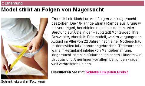 oder Silikonen? Während das Durchschnittsgewicht durch das Missverhältnis von Bewegung und Ernährung im reichen Westen immer höher wird (s.u.) und zu immer mehr "Zivilisationskrankheiten" führt, werden die Models und sogenannten "Playmates" der Herrenzeitschriften immer magerer. Wurden in den 50er und 60er Jahren die weiblichen Rundungen der "Miss August" durch ansehnlichen Speck geformt, so wuchern die Girls von heute meistens mit ihren falschen Pfunden in Form von Plastik-Plagiaten auf dürren Rippen. Kanadische Forscher analysierten die Playmates von 1978 und 1998. Sie stellten zwar keine signifikanten Veränderungen von Body Mass Index (=BMI) und Taille-Hüft-Verhältnis fest, kamen aber zu dem Ergebnis, dass 70 Prozent der 240 Frauen einen BMI unter 18.5 erreichten und somit untergewichtig waren (s.u.). "Alles Geschmacksache" mag man(n) vielleicht einwenden. In Ordnung, wenn diese "Mehr-Schein-als Sein-Welt" nicht eine Vorbild- und Nachahmfunktion für Teenager und nicht wenige Erwachsene hätte und einseitige Signale setzen würde. Erinnern möchte ich an den "inszenierten Skandal" in der deppert-albernen Heidi Klum "Germanys Next Topmodel" Casting Show 2006. Eine dünne Aspirantin wurde abgelehnt, da sie zu dick für eine Modelkarriere sei. Sie war 1,76 Meter groß und wog nur 52 Kilogramm (Maße 84-67-92) das ist BMI 16,8, was aus medizinischer Sicht stark untergewichtig ist! Das ist natürlich vollkommen verantwortungslos, aber Hauptsache die Einschaltquote stimmt! Wen von dieser Bohlen-Klum-&Co Sippe der Privatsender kümmert das schon. Übrigens: Heidi Klum selbst hat einen BMI von 17,2 (Größe 1,77 m, Gewicht 54 kg Konfektionsgröße 34 - 36 EU). Ist sie etwa ein "Dickerchen" unter den Hungerhaken?! Der durchschnittliche BMI bei amerikanischen Models ist laut einer Untersuchung nur 16,3! Was juckt es auch, wenn letzten Herbst das brasilianische "Supermodel" Ana Carolina Reston mit 21 Jahren an ihrer Magersucht starb oder im August 2006 in Montevideo das 22-jährige Model Luisel Ramos mit Herzversagen tot während eine Fashion Show zusammenbrach, nachdem sie 12 Kilogramm abgenommen hatte. Und nun, kaum zu glauben, hat es ein halbes Jahr später auch ihre Schwester Eliana erwischt! Wie nennen das die Klums und Model-Scouts oder Modezaren eigentlich? Kolalateralschaden? Restrisiko? Immerhin wird jetzt in Brasilien und Spanien ein Gesundheitszeugnis oder ärztliche Untersuchung von den Models verlangt. Spaniens Kampf gegen dürre Vorbilder Genau das wurde der spanischen Gesundheitsministerin Elena Salgado nun zu bunt. Sie plädiert für ein "gesundes Schönheitsideal bei Frauen". Erst verbannte sie im September 2006 die Magermodels mit einem BMI von unter 18 von den Laufstegen des Landes und nun rückt sie in einer neuen Kampagne den Modepuppen in den Schaufenstern Spaniens zu Leibe. Außerdem soll das Konfektionsgrößen Chaos in einer konzertierten Aktion von internationalen Modehäusern und Gesundheitsministerium neu geordnet und vereinheitlicht werden. Dazu sollen die spanischen Frauen auf Basis von 8.500 Freiwilligen mit Lasertechnik neu vermessen und bis zum Jahre 2008 neue Standards geschaffen werden. Ziel ist es, die Durchschnittsspanierin nicht mehr mit utopischen Traumgrößen, in die kaum eine Frau rein passt, zu terrorisieren, sondern die real existierende modebewusste Käuferin zu bedienen. "Frau soll sich so fühlen wie sie ist..." so Angeles Heras, die Chefin der Konsumbehörde. Rund und gesund? So weit so gut und auch in Ordnung. Unterernährung, krankhafte Magersucht bis zum Tod und die Essbrechsucht vieler verhaltensgestörten "Hungerhaken" auf dem Catwalk, aber auch auf den Titelfotos der Mode- und Glamourzeitschriften sollen wie Barbiepuppen kein einseitig ästhetisches Vorbild für Frauen und heranwachsende Mädchen sein, worüber sich engagierte Ärzte und die Gesundheitsbehörden zunehmend beklagen. Andererseits ist es auch nicht in Ordnung ständig die Kleidergrößen den Gegebenheiten oder dem sehr vagen "Wohlfühlgewicht" ("Ich bin rund und gesund!") anzupassen und damit alles für in Ordnung zu erklären. Nicht nur Untergewicht, sondern viel verbreiteter ist Übergewicht ein Risikofaktor für zahlreiche Erkrankungen wie Herzkreislaufbeschwerden, Diabetes Typ II oder orthopädischen Überlastungen. In den USA wird der größte Teil der Gesamtkosten des Gesundheitssystems durch übergewichtsbedingte Fettstoffwechselerkrankungen und Bewegungsmangel verursacht. Jeder zweite Deutsche ist zu dick! Schlagen wir beim Statistischen Bundesamt nach (Mikrozensus 2005, veröffentlicht Juni 2006): Die Weltgesundheitsorganisation (WHO) stuft Erwachsene mit einem Body-Mass-Index über 25 als übergewichtig, mit einem Wert über 30 als stark übergewichtig (=adipös, fettsüchtig) ein. So gilt beispielsweise ein 1,80 m großer Erwachsener ab 81 kg als übergewichtig und ab 97 kg als stark übergewichtig. Die WHO spricht von Untergewicht, wenn der BMI unter 18,5 ist. Im Jahr 2005 waren in Deutschland unter den Erwachsenen insgesamt 58% der Männer und 42% der Frauen übergewichtig. Der Anteil ist im Vergleich zu 1999 (Männer 56%, Frauen 40%) gestiegen. 14% der Männer und 13% der Frauen hatten starkes Übergewicht. In allen Altersgruppen waren Männer häufiger übergewichtig als Frauen. Untergewicht ist in Deutschland weitaus weniger verbreitet als Übergewicht. Frauen waren 2005 wesentlich häufiger (4%) untergewichtig als Männer (1%). Junge Frauen im Alter von 18 und 19 Jahren waren sogar zu 14% untergewichtig, 20- bis 24-Jährige noch zu 11%. Dicke Eltern als falsches Vorbild! Ich erlaube mir hier die provozierende Frage, ob dicke Eltern für unsere Teenager nicht ein größeres Gesundheitsrisiko und ein falsches Vorbild darstellen wie vergleichsweise die dünnen Hunger-Models!? Was ist mit stark übergewichtigen Schauspielern wie Ottfried Fischer (Bulle von Tölz, Pfarrer Brown) oder etwa dicken Ärzten, Kindergärtnerinnen und Lehrern? Berufsverbot? Bei uns